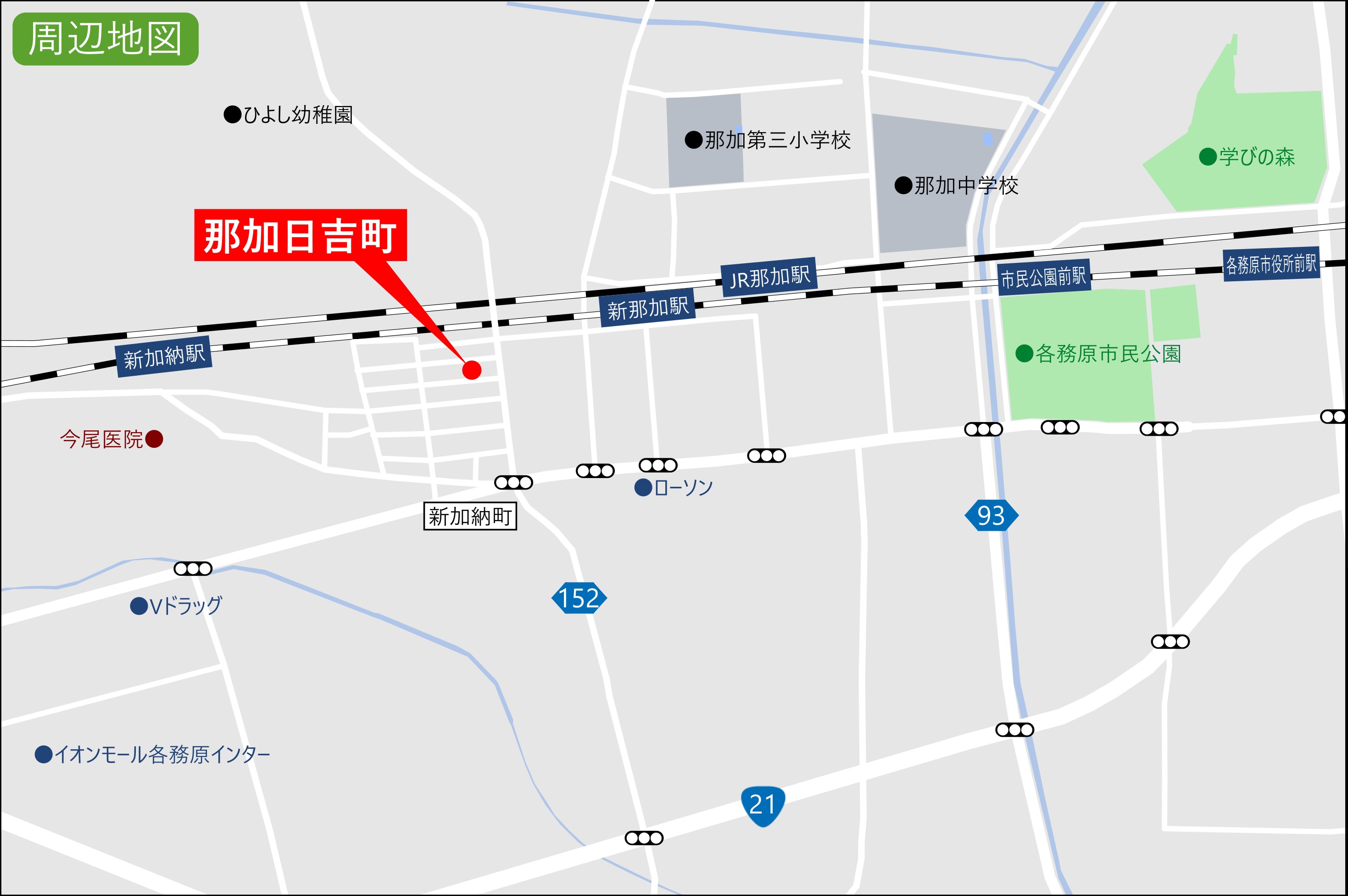 | 交通 | 名鉄各務原線「新那加駅」まで徒歩7分(500m) JR高山本線「那加駅」まで徒歩9分(700m) |